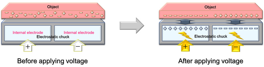 Elektrostatické sklíčivo (ESC) je speciální typ upínače, který používá elektrostatickou sílu k držení, stisknutí a vyzvednutí objektů (obrobky). Jakýkoli materiál nese pozitivní a negativní poplatky, které jsou pro pouhé oko neviditelné. Když je materiál umístěn na ESC a na vnitřní elektrody ESC se nanese bipolární napětí, pozitivní a negativní náboje se v materiálu pohybují tak, aby odpovídaly polaritě vnitřních elektrod ESC. Tato přitažlivost mezi ESC a materiálem se nazývá elektrostatická síla a je také základním principem za našimi upínači.